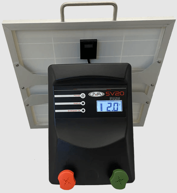 JVA SV20 Solar Electric Fence Energizer makes animal control a breeze. The integrated solar panel and battery save time and money and is designed to give years of trouble-free service. This unit has the ability to be recharged from the 24vDC external plug pack which offers more versatility on cloudy days. Ready to go straight out of the box!